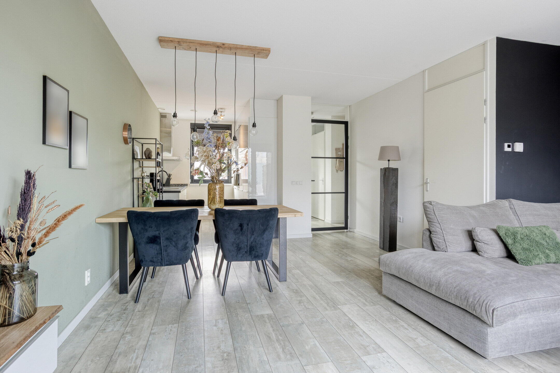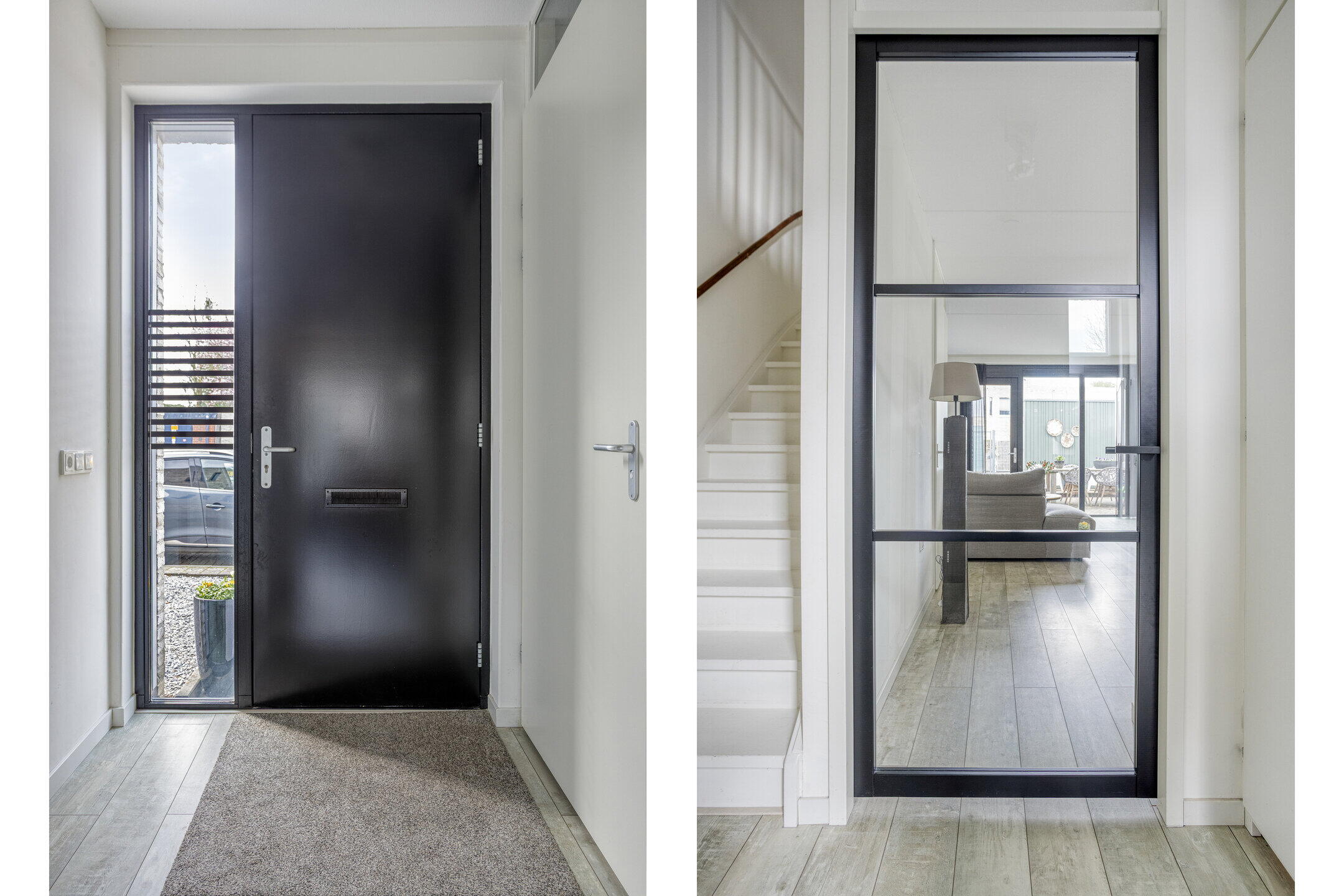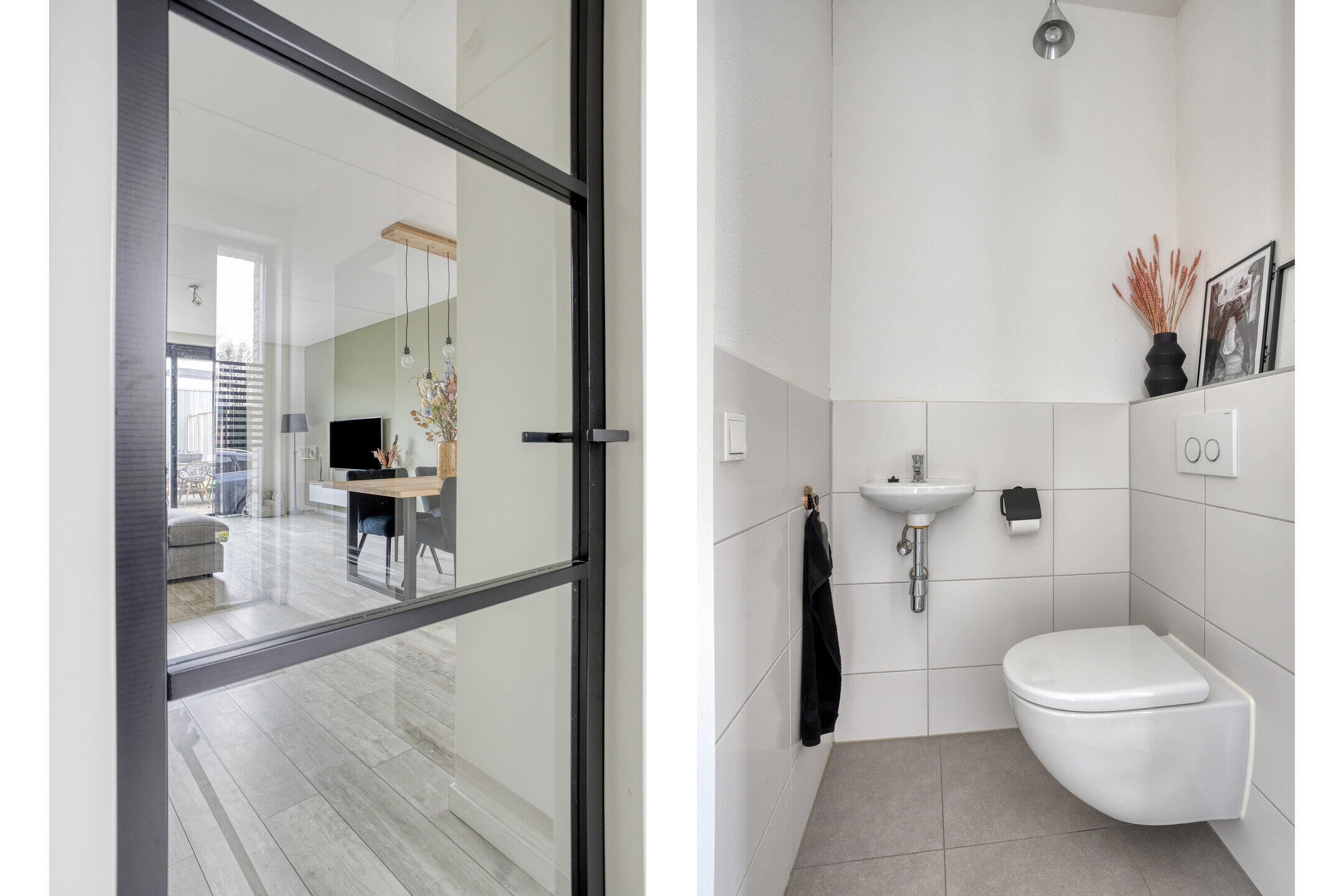 Je komt binnen in een lichte en verzorgde hal met strakke wanden en een mooie lichte vloer. Hier vind je de trapopgang naar de eerste verdieping en een modern afgewerkt toilet. Via een stijlvolle glazen deur bereik je de woonkamer, wat direct zorgt voor een ruimtelijk en open gevoel.
