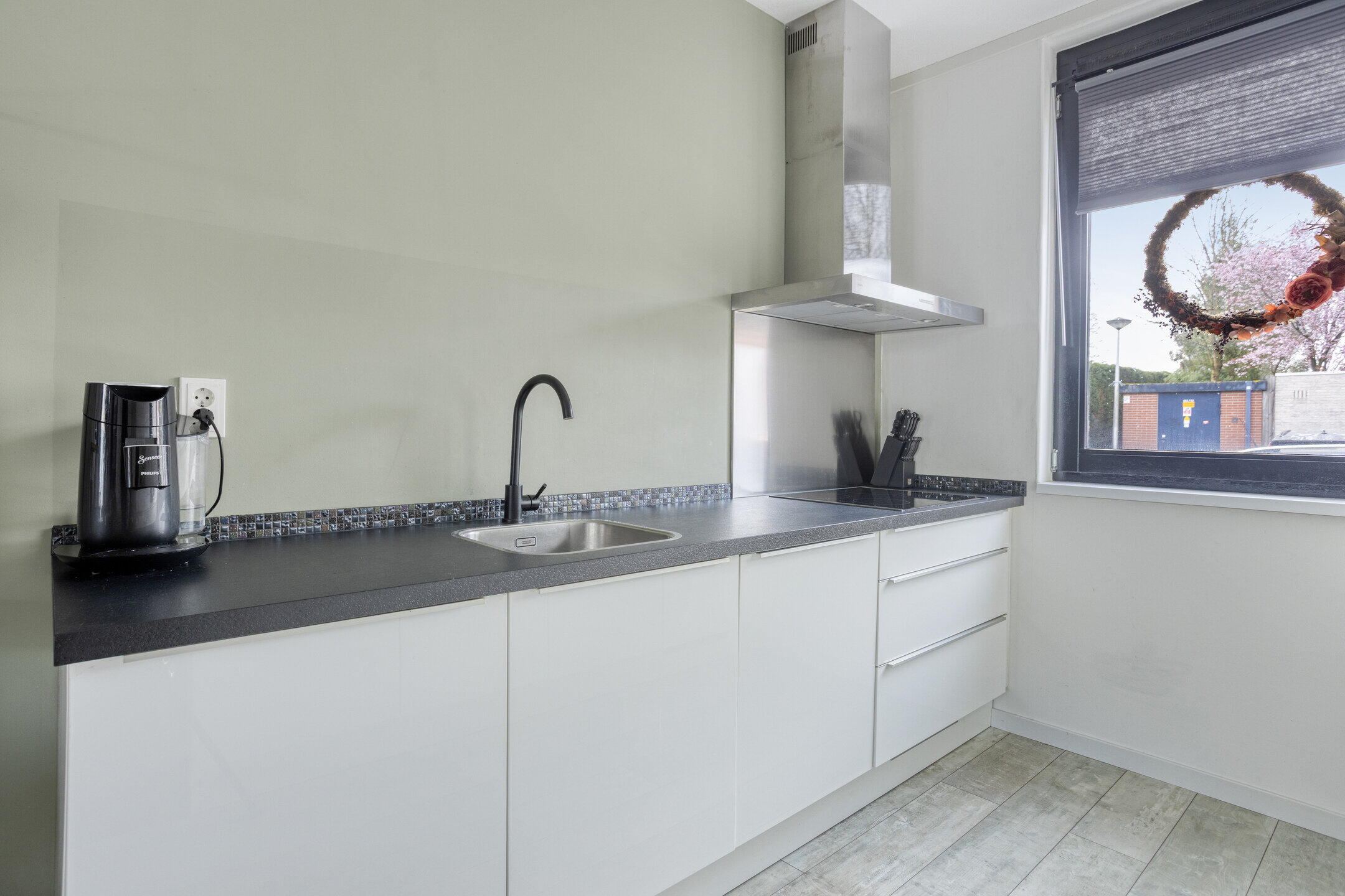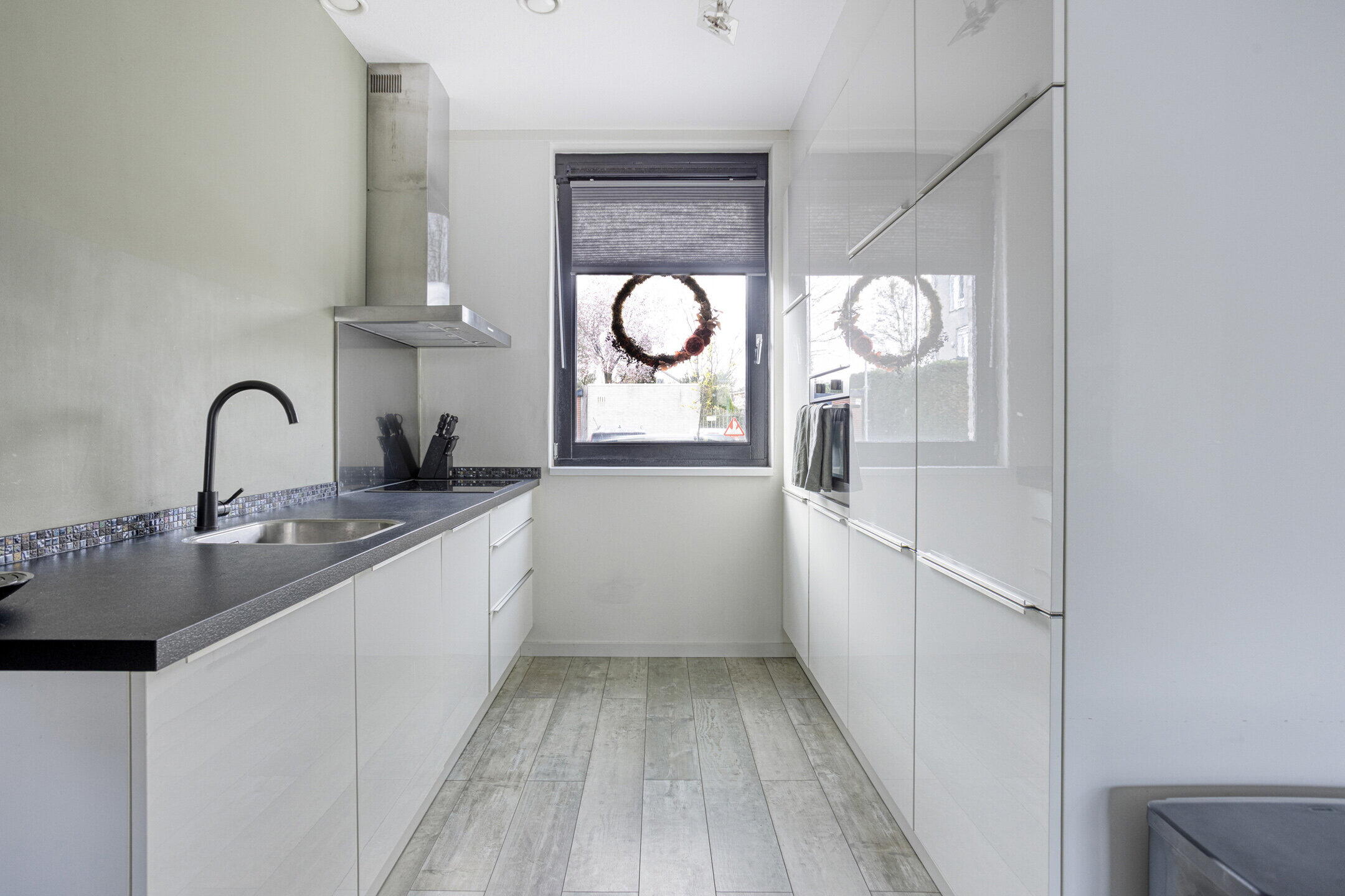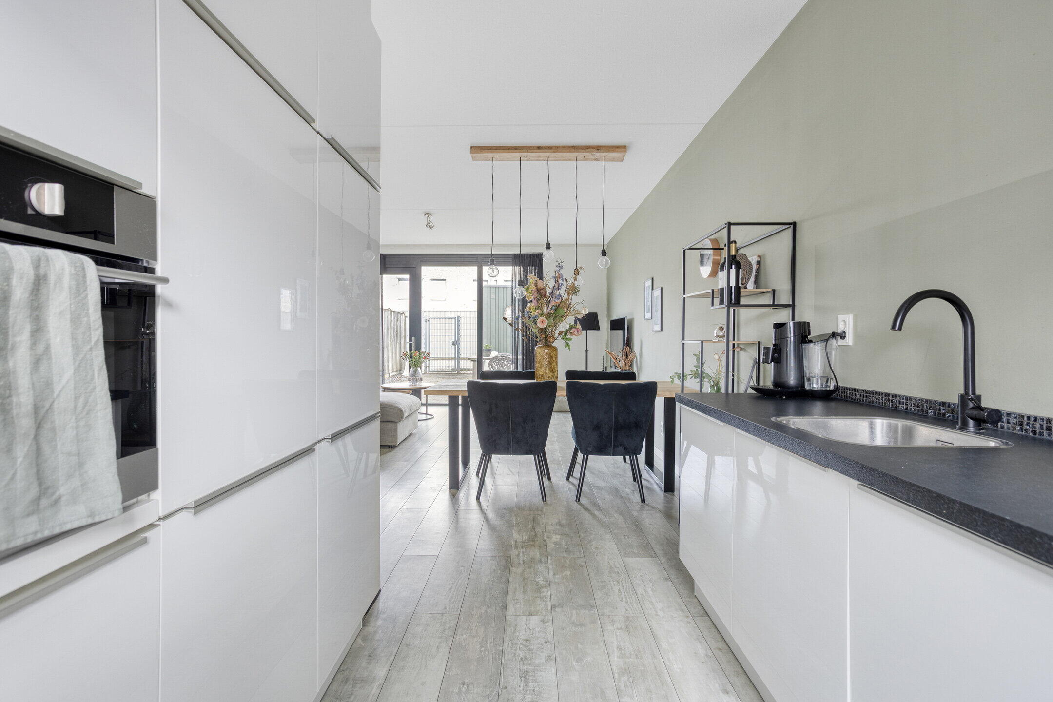 De woonkamer is heerlijk licht en biedt volop ruimte voor een comfortabele zithoek en een gezellige eettafel. Daarnaast is er een praktische opbergkast aanwezig en heb je direct toegang tot de tuin — ideaal voor binnen-buiten leven. Aan de voorzijde van de woning bevindt zich de moderne keuken, voorzien van diverse inbouwapparatuur. Een fijne plek om te koken terwijl je uitkijkt over de straat.
